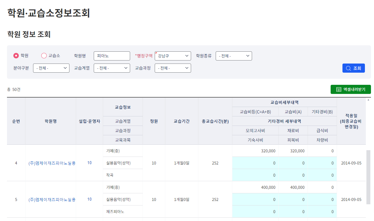 학원명, 행정구역, 학원종류, 분야구분, 교습 계열, 교습 과정 등을